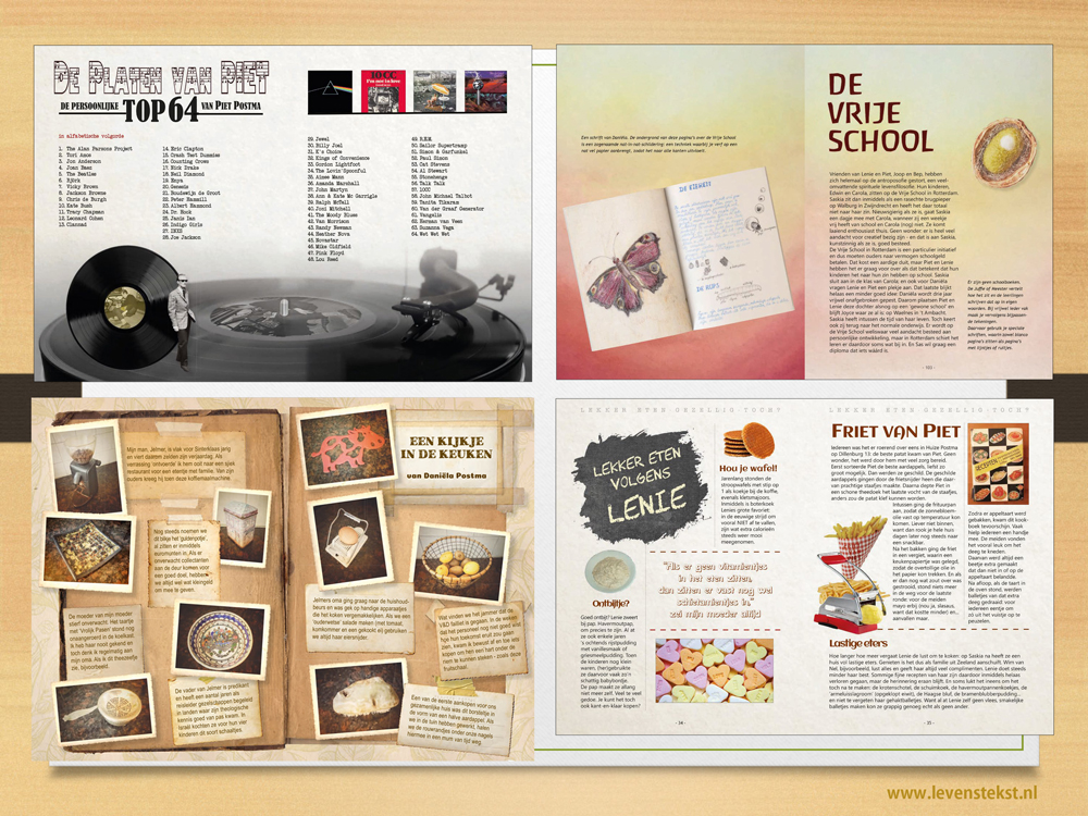 Voor Daniëla Postma is het steeds weer een creatieve uitdaging om het thema (of de hoofdpersoon) in een levensverhaal óók zichtbaar te maken in de vormgeving van een boek. Daarnaast begeleidt Daniëla regelmatig mensen die de vormgeving van hun verhaal grotendeels zelf willen verzorgen; zij helpt hen dan met het ontwerpen van een mooie basis voor het binnenwerk en een passende cover.